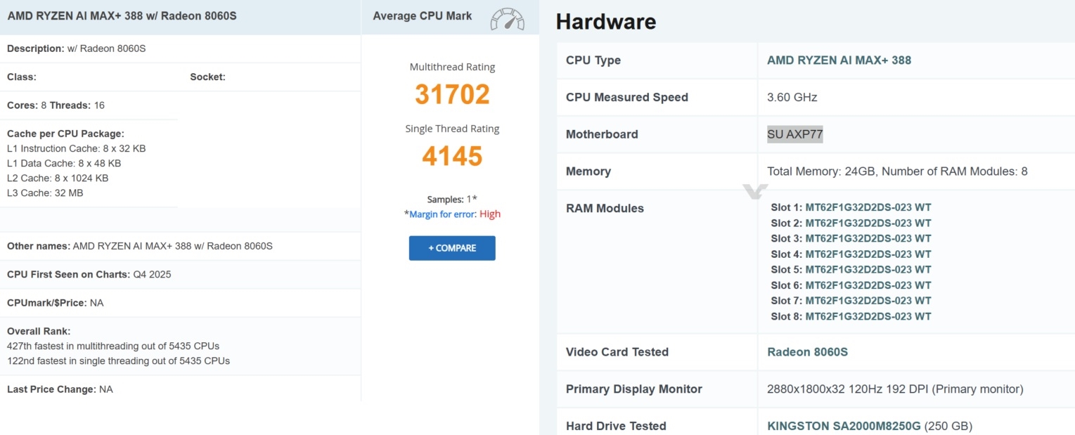 PassMark’ta görünen Ryzen AI MAX+ 388, serinin görece daha erişilebilir modeli olacak. İşlemci 8 çekirdek ve 16 izlekli bir tasarıma sahip ve CPU tarafında tek çiplet yapı korunuyor. Grafik birimi, 40 CU yapılandırması sayesinde daha üst seviye MAX+ modelleriyle aynı grafik kapasitesini sunuyor. Ayrıca 40MB önbellek ve 5.0GHz’e ulaşan hızlar sunacak.