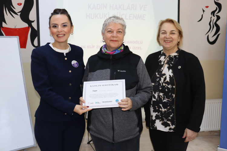 Üç hafta süren Güçlü Kadın Güçlü Toplum Projesi kapsamında eğitimlerini tamamlayan katılımcılara, Kadın ve Aile Hizmetleri Müdürü Burcu Bineklioğlu sertifikalarını teslim etti. Kadınların kendi haklarını bilmelerini, toplumsal hayata daha güçlü katılmalarını ve problem çözme becerilerini geliştirmelerini amaçlayan proje yoğun ilgi gördü.
