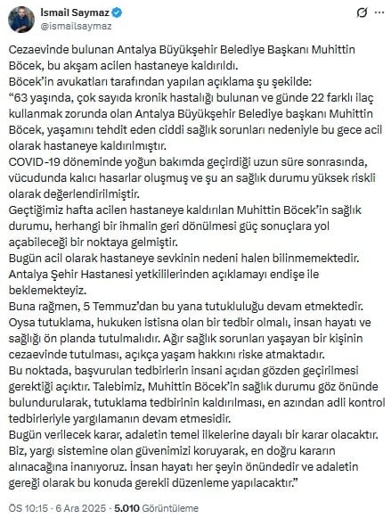 “63 yaşında, çok sayıda kronik hastalığı bulunan ve günde 22 farklı ilaç kullanmak zorunda olan Antalya Büyükşehir Belediye başkanı Muhittin Böcek, yaşamını tehdit eden ciddi sağlık sorunları nedeniyle bu gece acil olarak hastaneye kaldırılmıştır.